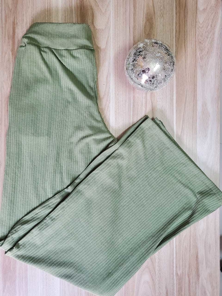 Calça pantalona, canelada com bolsos e aberturas nas laterais.
