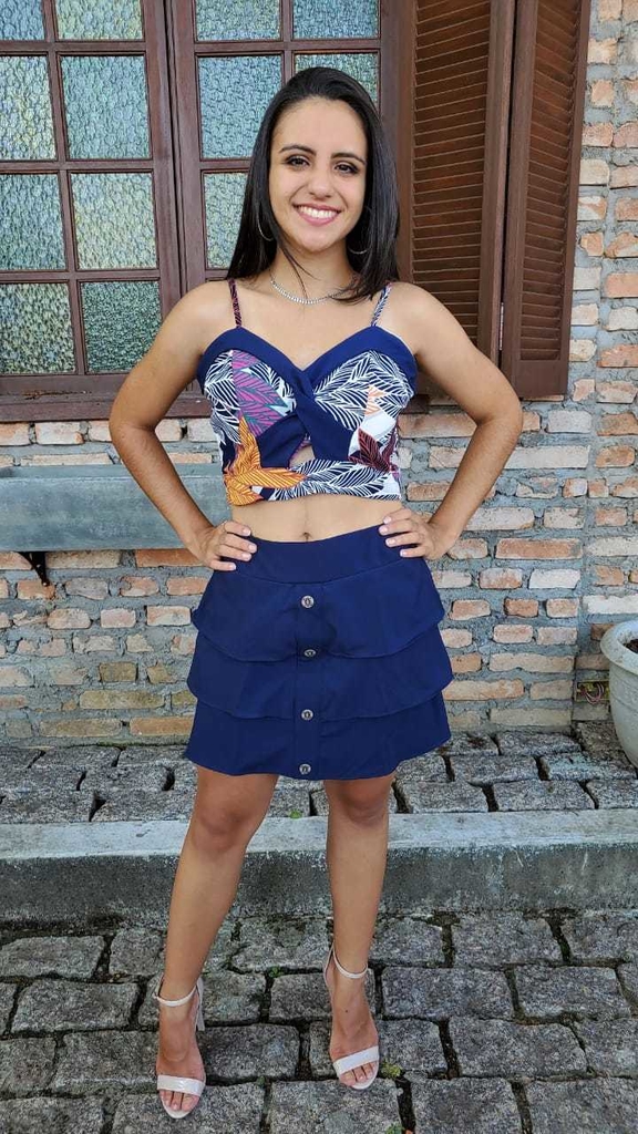 Conjunto Gorete cropped em alças delicadas e um charme de laço frontal para combinar com a saia em camadas super delicadas.