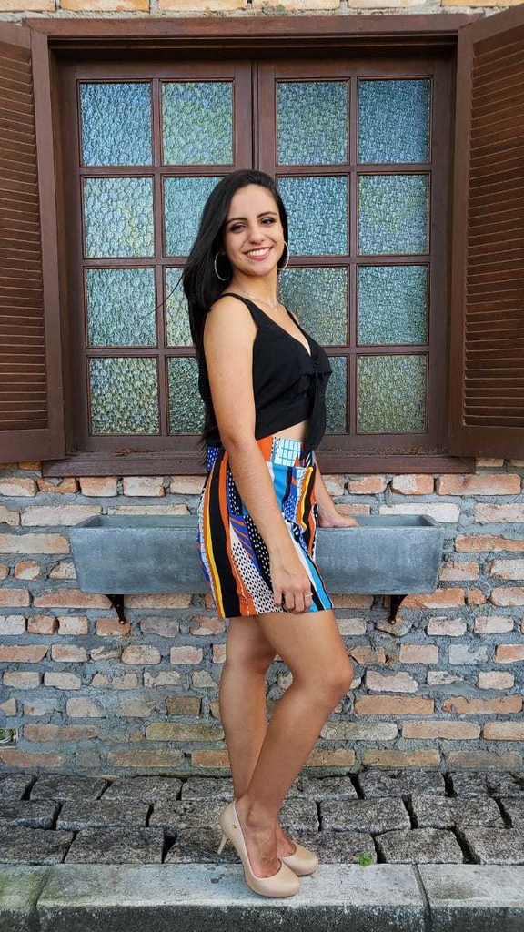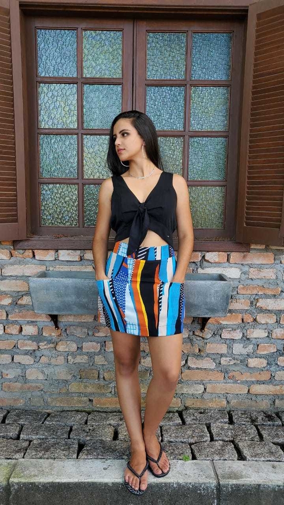 Conjunto Rayssa Cropped com detalhe laço frontal e saia estampada com bolsos. Um charme de conjunto.
