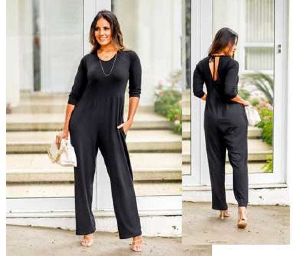 Macacão Longo com bolsos e abertura nas costas em decote V.